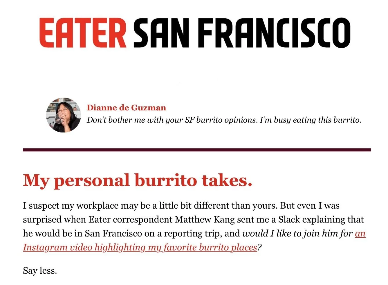 I suspect my workplace may be a little bit different than yours. But even I was surprised when Eater correspondent Matthew Kang sent me a Slack explaining that he would be in San Francisco on a reporting trip, and would I like to join him for an Instagram video highlighting my favorite burrito places?