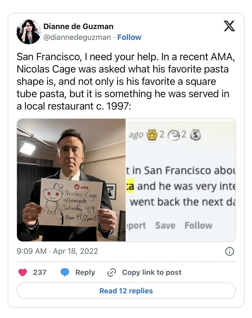 For media covering the AMA, Cage’s answer was just a kooky one-off. But for the food-obsessed and San Francisco locals, the answer set off a fun, low-stakes round of internet sleuthing. It presented a two-part mystery: What pasta shape is a “square tube”? And what San Francisco restaurant serves, or served, a dish the actors loved so much they ate it twice in two days?