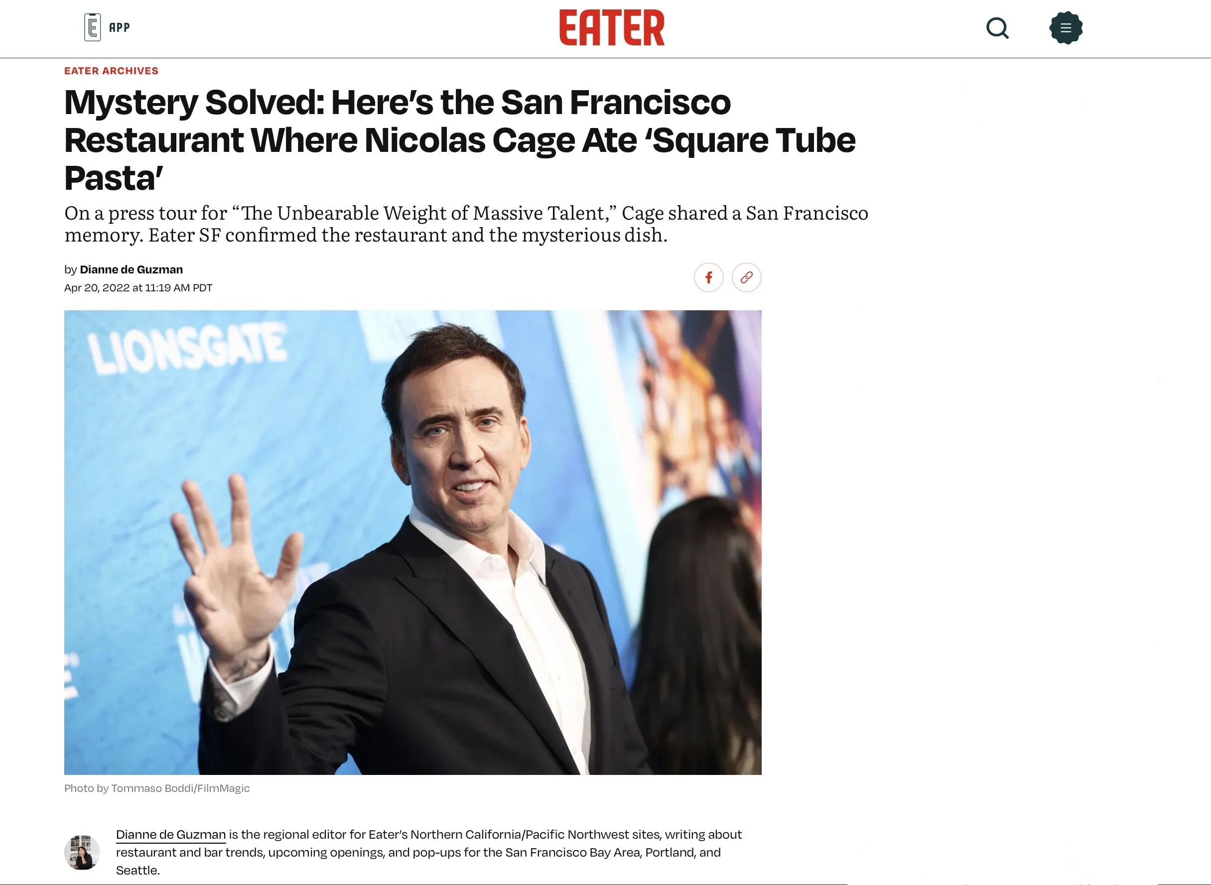 Mystery Solved: Here’s the San Francisco Restaurant Where Nicolas Cage Ate ‘Square Tube Pasta’